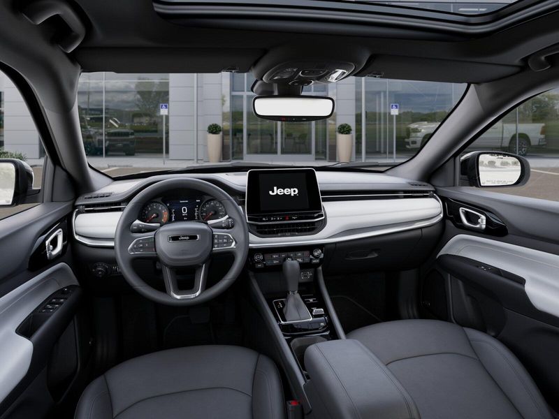 FACTORY REMOTE STARTER, BACK UP CAMERA, BLIND SPOT AND CROSS PATH DETECTION, REAR PARK ASSIST WITH STOP, Jeep Wave, Rear Seat Reminder Alert, Drowsy Driver Detection, Dual Pane Panoramic Sunroof, Jeep Clean Air System, Tire Service Kit, No Spare Tire, Windshield Wiper De-Icer, Pedestrian/Cyclist Emergency Braking, Full Speed Forward Collision Warning Plus, Compass Limited, 4D Sport Utility, 2.0L I4 DOHC, 8-Speed Automatic, 4WD, Bright White Clearcoat, Black w/Leatherette Seats, 3.73 Final Drive Ratio, Delay-off headlights, Front fog lights, Heated front seats, Overhead console, Power Front/Fixed Rear Full Sunroof, Premium Alpine Speaker System, Quick Order Package 29G, Sun and Sound Group, Traction control, Turn signal indicator mirrors, Wheels: 18'' x 7'' Painted Diamond Cut Alum (DISC). 2025 Jeep Compass Limited 2.0L I4 DOHC 4WD Bright White Clearcoat
