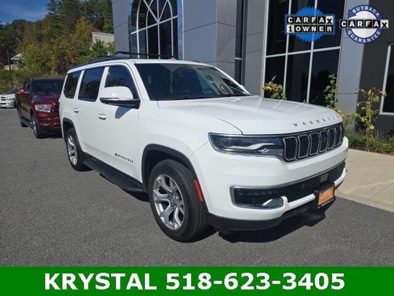 ONE OWNER, CLEAN CARFAX-NO ACCIDENTS, RECENT TRADE IN, SERVICE RECORDS AVAILABLE, NAVIGATION GPS NAV, MOONROOF/SUNROOF, BLUETOOTH/HANDS FREE CELL PHONE, FACTORY REMOTE STARTER, BACK UP CAMERA, 20'' FullyPainted Silver Litho Aluminum Wheels, Heated SecondRow Seats, Heated Steering Wheel Heated Front Seats Ventilated Front Seats, REAR POWER LIFTGATE, Wagoneer Series I, 4D Sport Utility, 5.7L V8, 8-Speed Automatic, 4WD, Bright White Clearcoat, Black Leather, 2nd Row Manual Window Shades, Active Lane Management System, Adaptive Cruise Control w/Stop & Go, Auto High Beam Headlamp Control, Convenience Group I, Dual-Pane Panoramic Sunroof, Heated Second Row Seats, Memory Steering Column, P&P Park & Unpark Assist w/Stop System, Rain Sensitive Windshield Wipers, Wireless Charging Pad. 2022 Jeep Wagoneer Series I 4WD 8-Speed Automatic Bright White Clearcoat Recent Arrival! 5.7L V8 Certified. Certified Pre-Owned Go Details:
